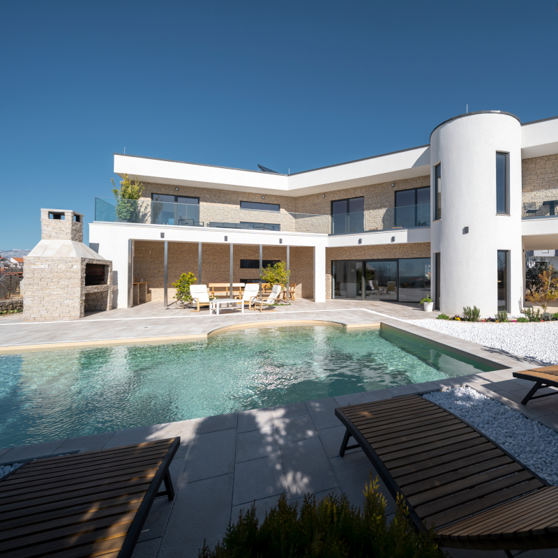 Boasting air-conditioned accommodation with a private pool, mountain view and a balcony, Villa Elani – Stylish And Modern 6 bedroom Seaview Villa is located in Vrsi. Situated 1.5 km from Deep Draga Beach, the property features a seasonal outdoor swimming pool and free private parking.